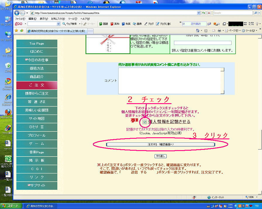 それから、下の方の 3 「注文する(確認画面へ)」 のボタンをクリックします。 |