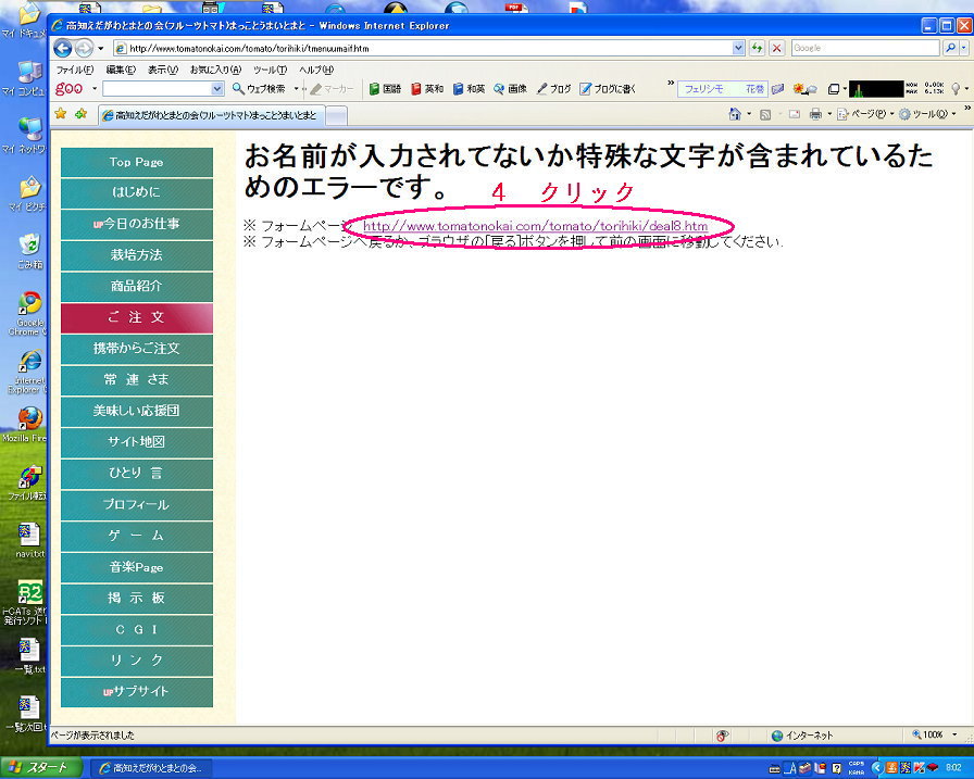 これで情報はクリア(解除)されました。そのためエラー画面に移ります。エラー画面はその都度変わることがありますが、下図のリンクは変わらないのでリンクをクリックして注文画面に戻ってください。 |
