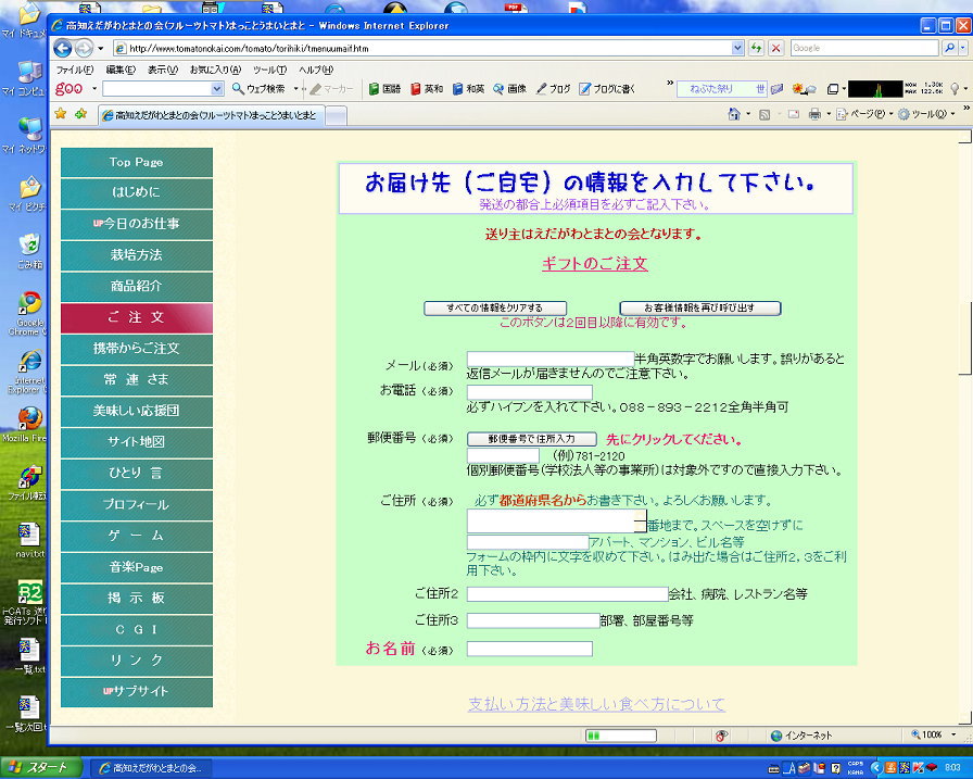 まず、注文画面の中ほどにある 「全ての情報をクリアする」 というボタンをクリックします。すると、テキストボックスのデータがクリアされます。 |